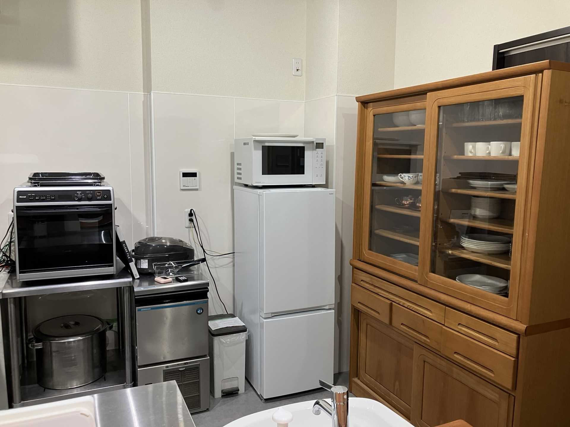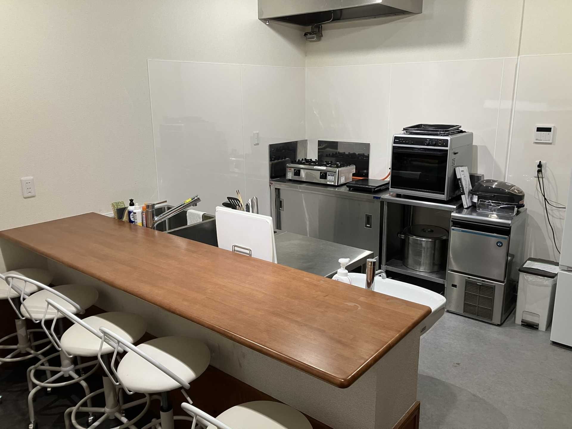炊飯器や電子レンジ、基本的な調理器具や食器が揃っているので、試食会にも。製氷機も完備しており、お菓子作りに便利です。